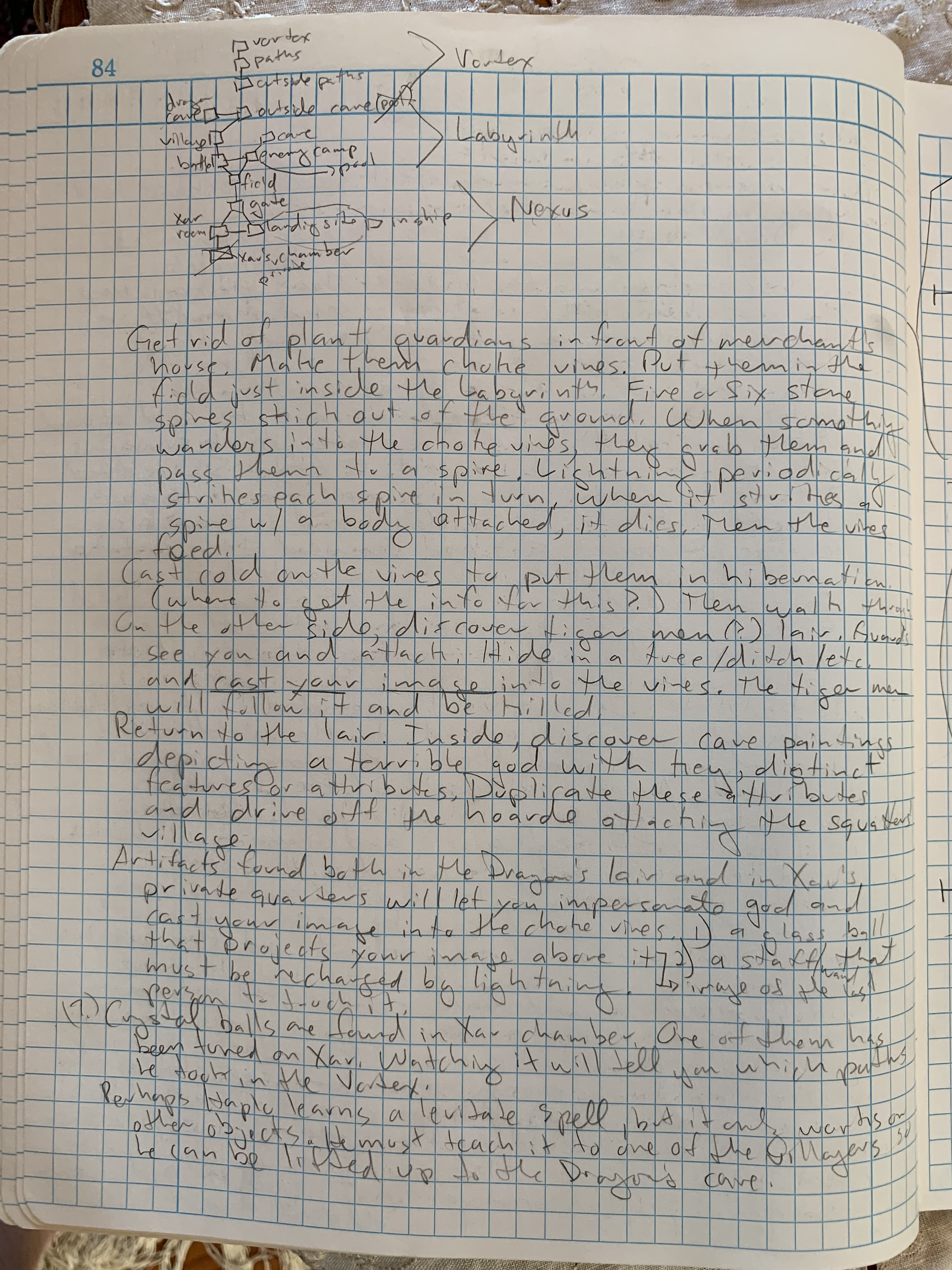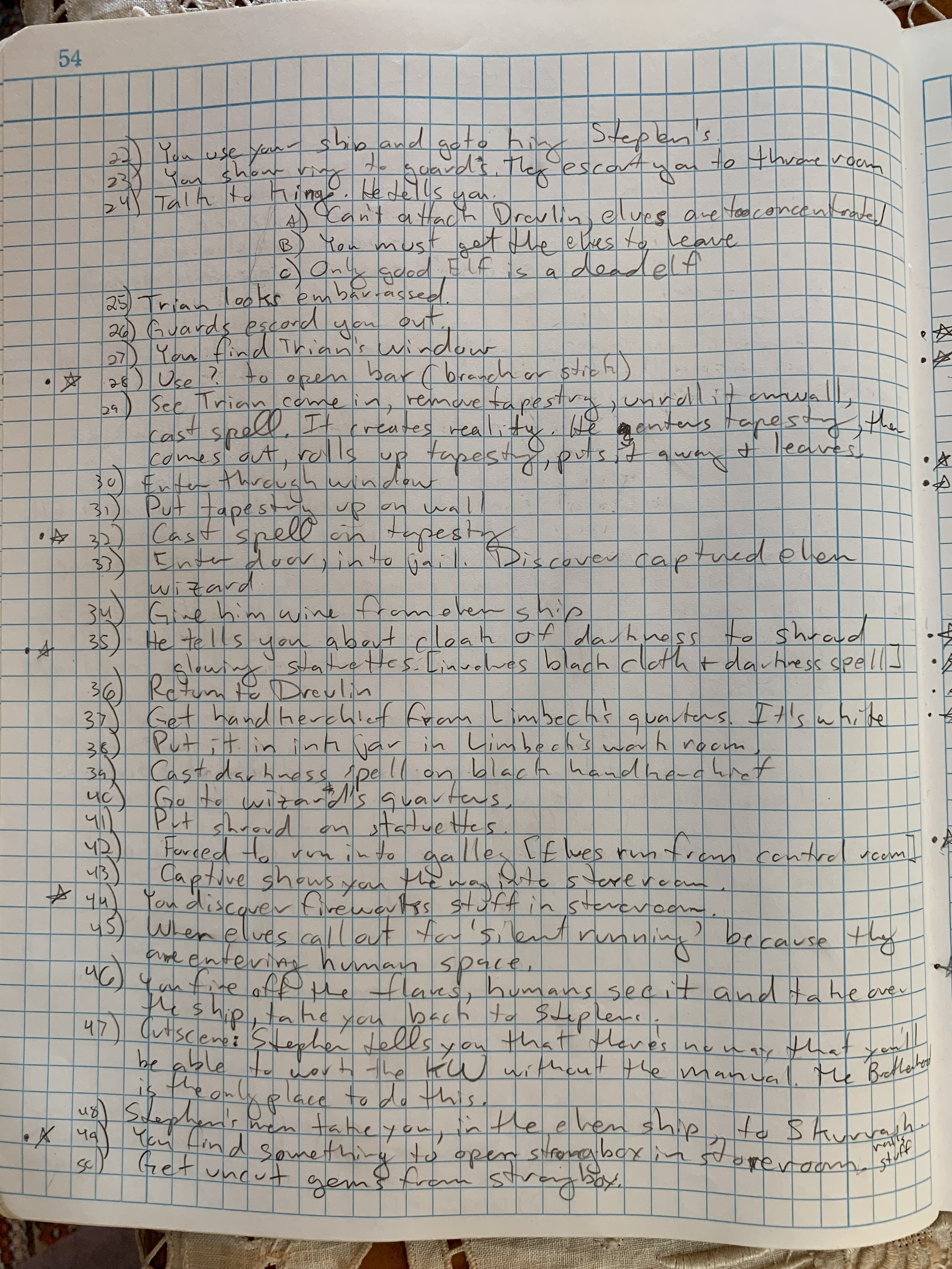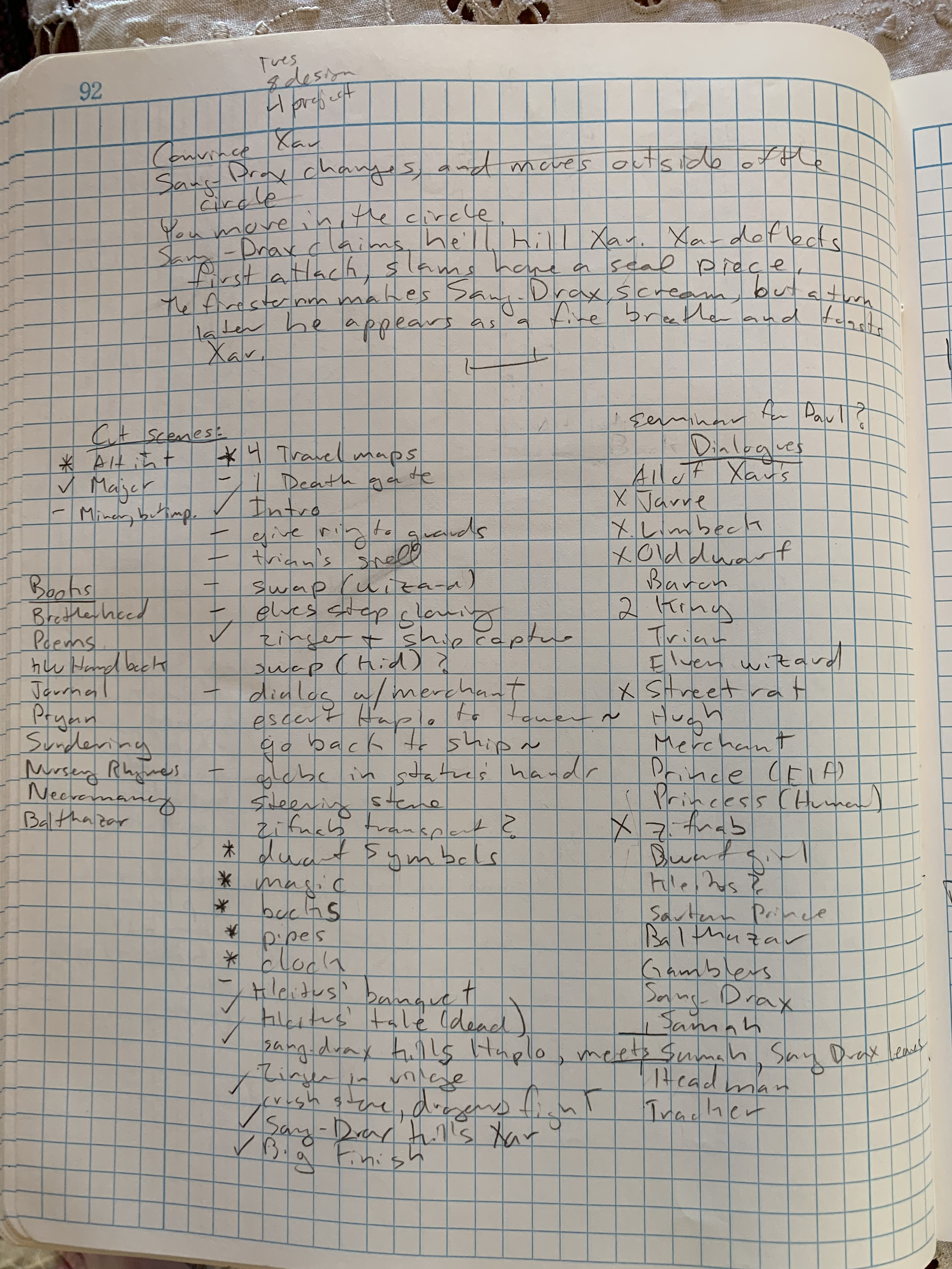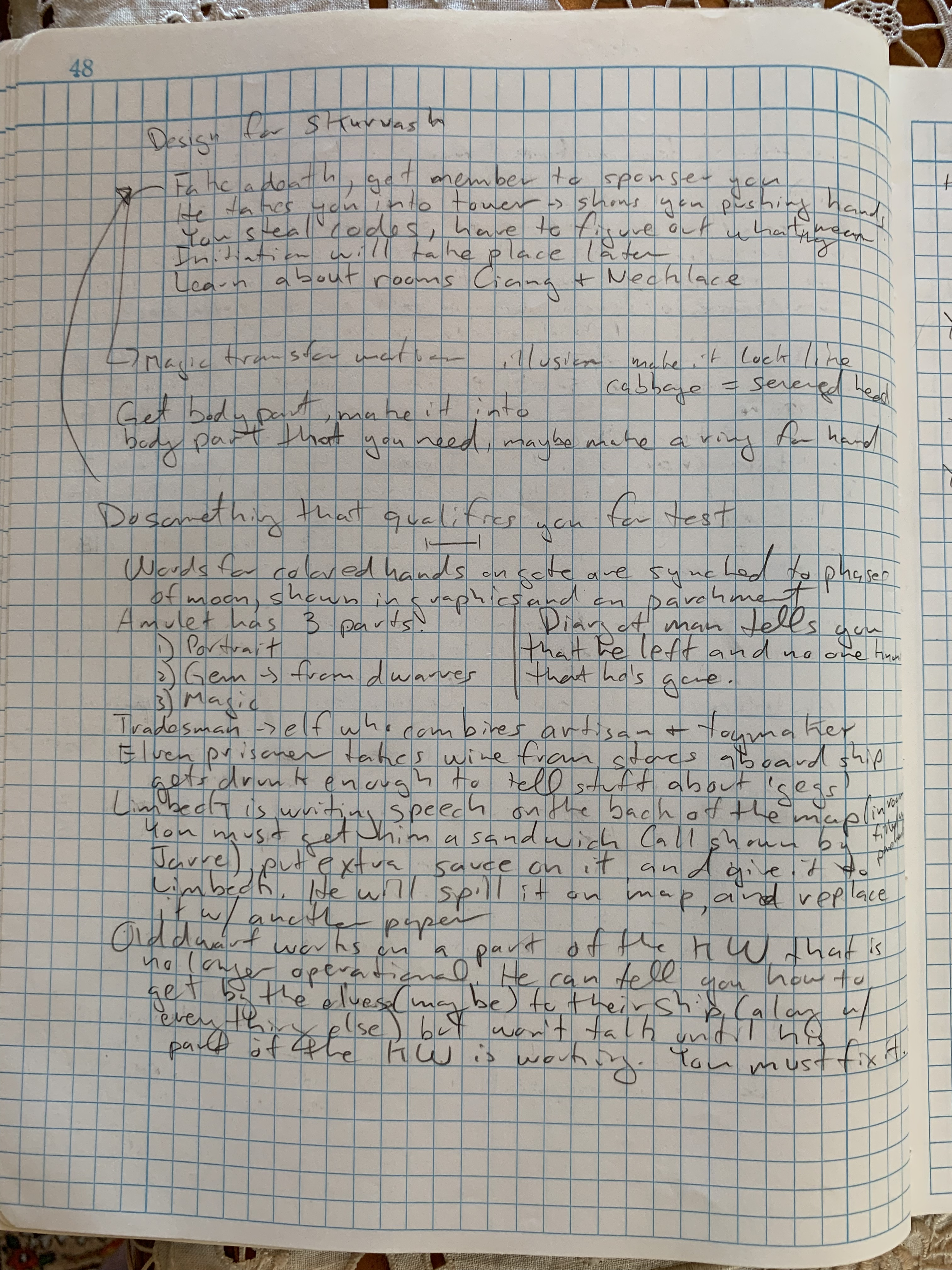 Back in the old days, we didn’t have your new-fangled phones or tablets, or even laptops really. I kept all of my notes in an Engineering Notebook. Given that I rediscovered this recently, I figured it might be illuminating to reveal the design scribbles for Death Gate here. Keep in mind that it not only contains the actual design, but a lot of false starts or ideas that I might have not intended to use, but didn’t want to forget (including the entire section I dumped in Arianus). If you can decipher my handwriting and want to get a little insight into at least my design process for an adventure game, then you’re welcome to dive in.