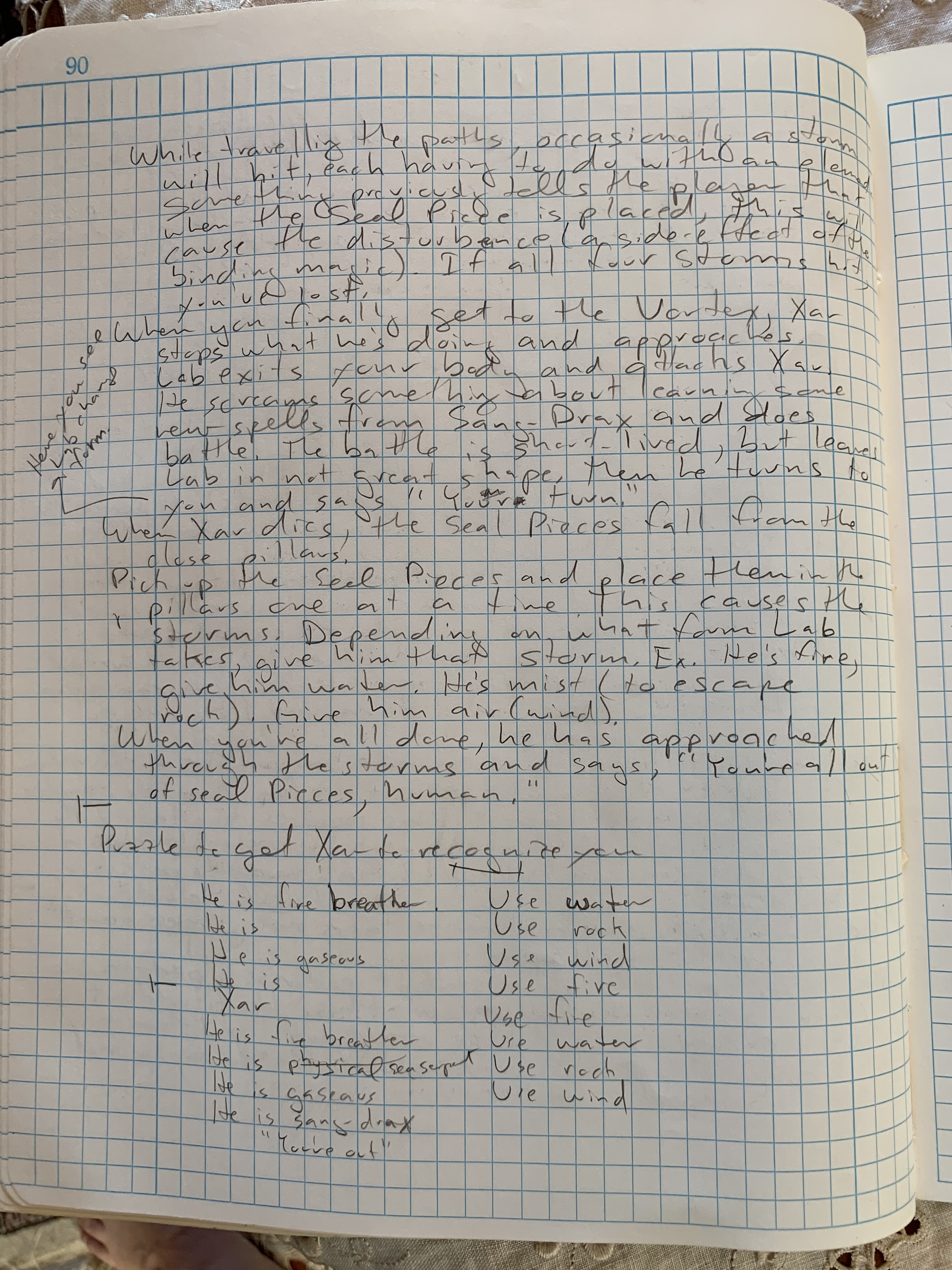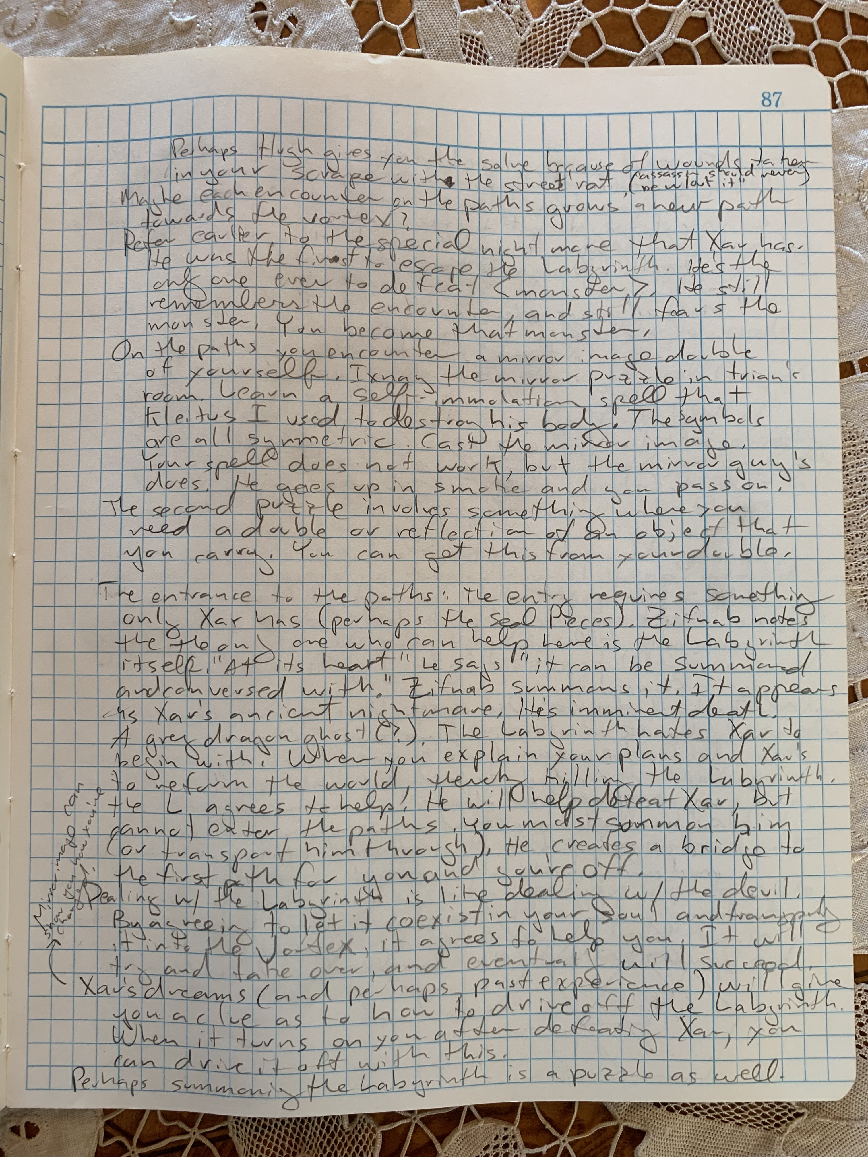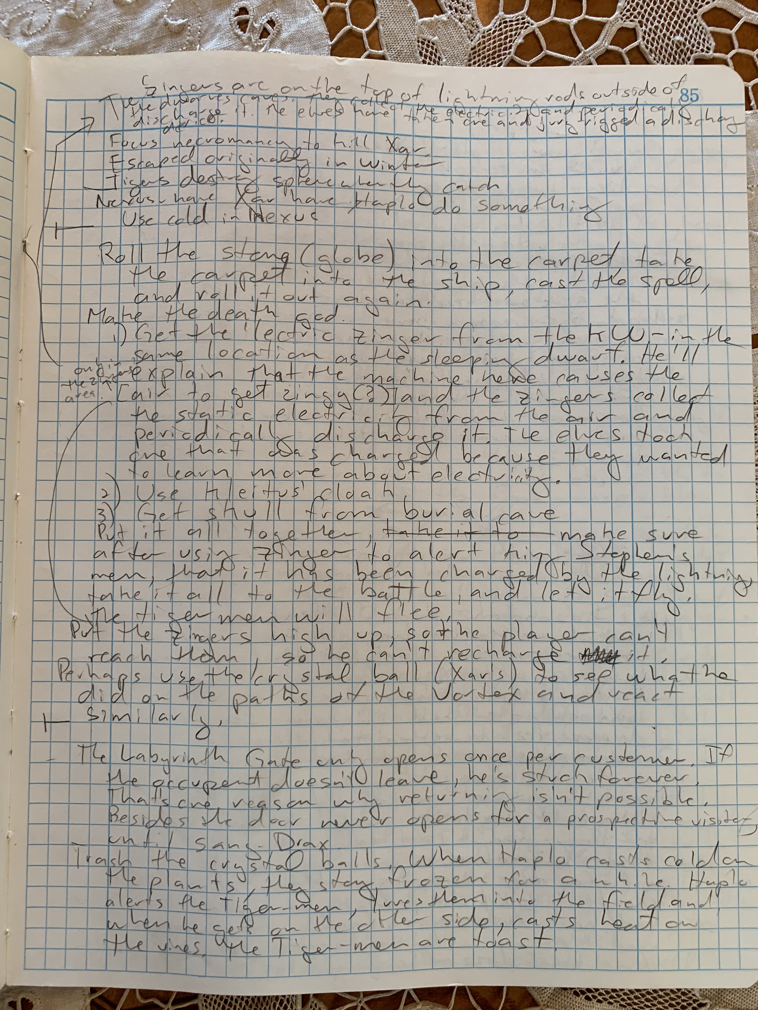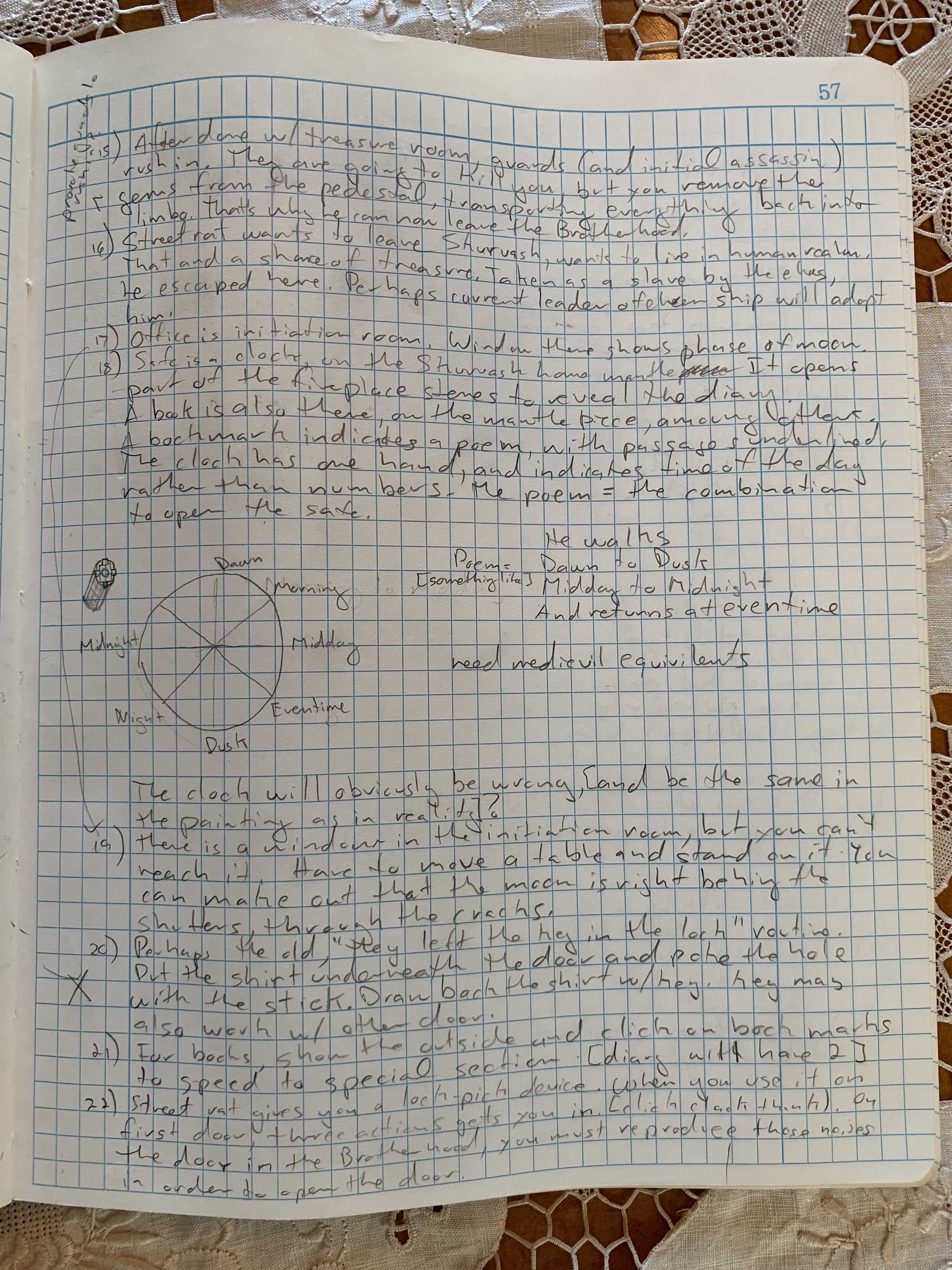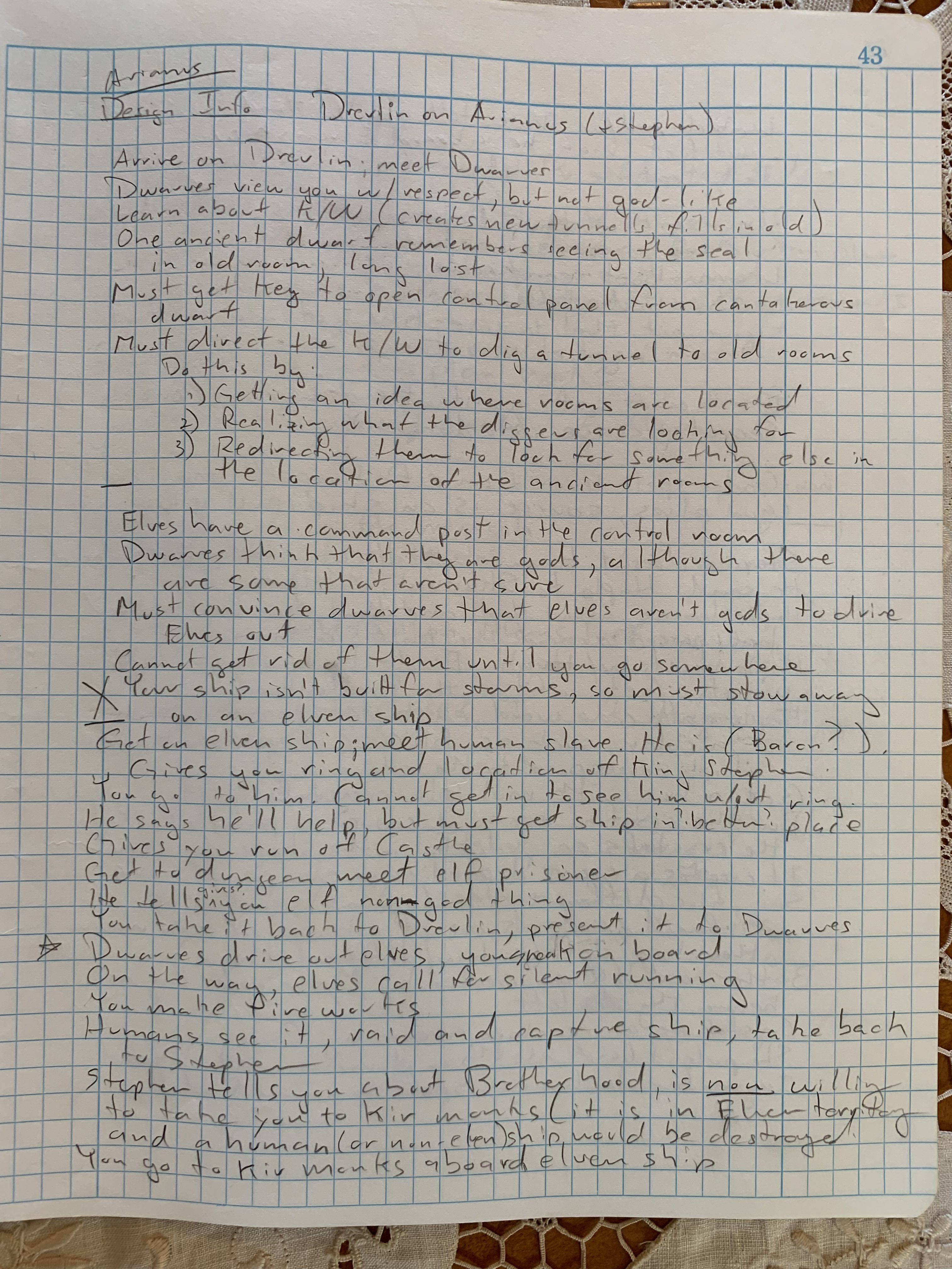 Back in the old days, we didn’t have your new-fangled phones or tablets, or even laptops really. I kept all of my notes in an Engineering Notebook. Given that I rediscovered this recently, I figured it might be illuminating to reveal the design scribbles for Death Gate here. Keep in mind that it not only contains the actual design, but a lot of false starts or ideas that I might have not intended to use, but didn’t want to forget (including the entire section I dumped in Arianus). If you can decipher my handwriting and want to get a little insight into at least my design process for an adventure game, then you’re welcome to dive in.