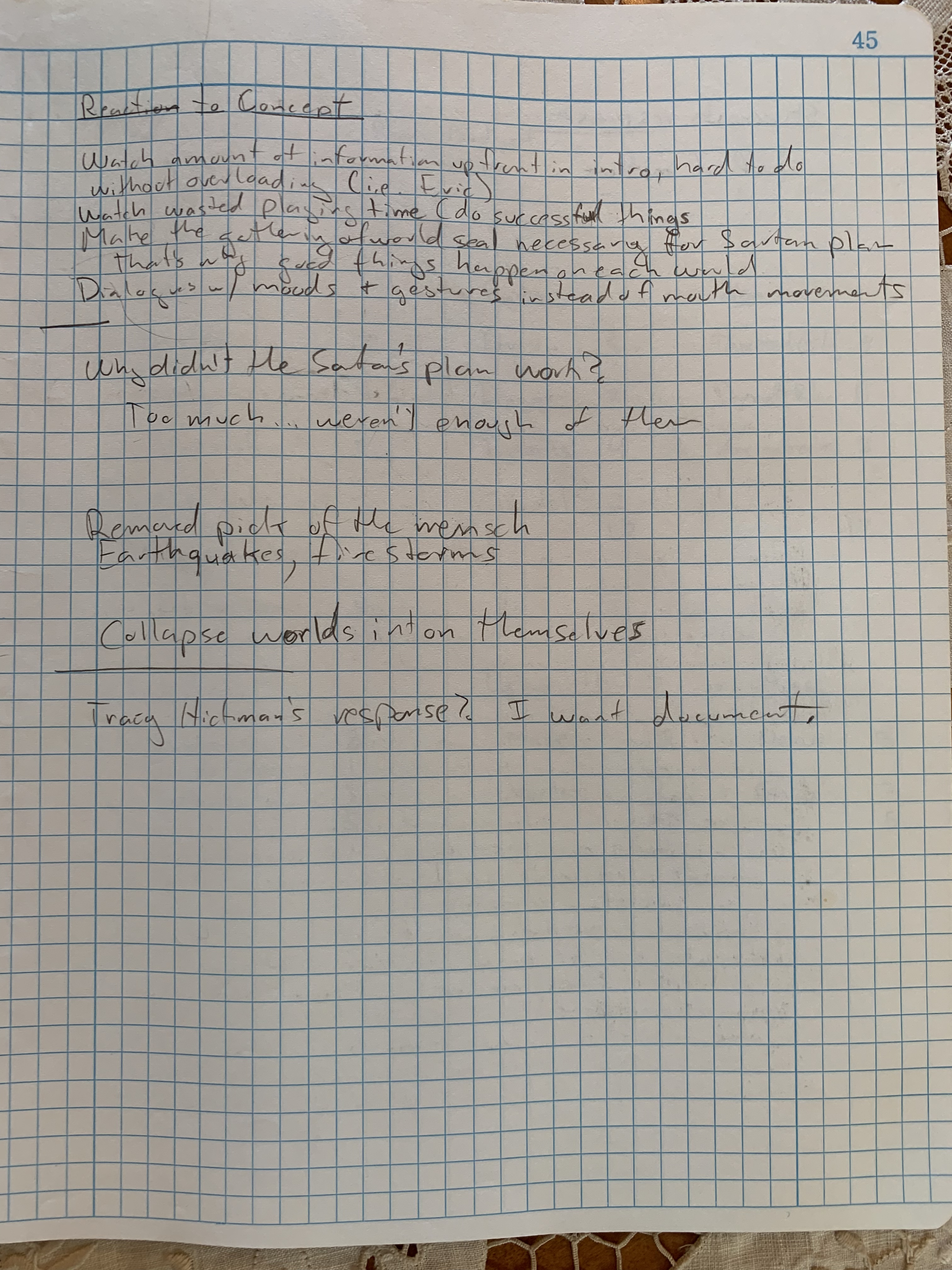 First, I violated my own rules of puzzle design; it was unfair, because it required that you remember one element of a conversation that was no longer available (the names of the six Sartan devils). In every other puzzle, you should be able to get the information you need to solve a puzzle, even repeatedly, at the moment when you’re trying to solve it.