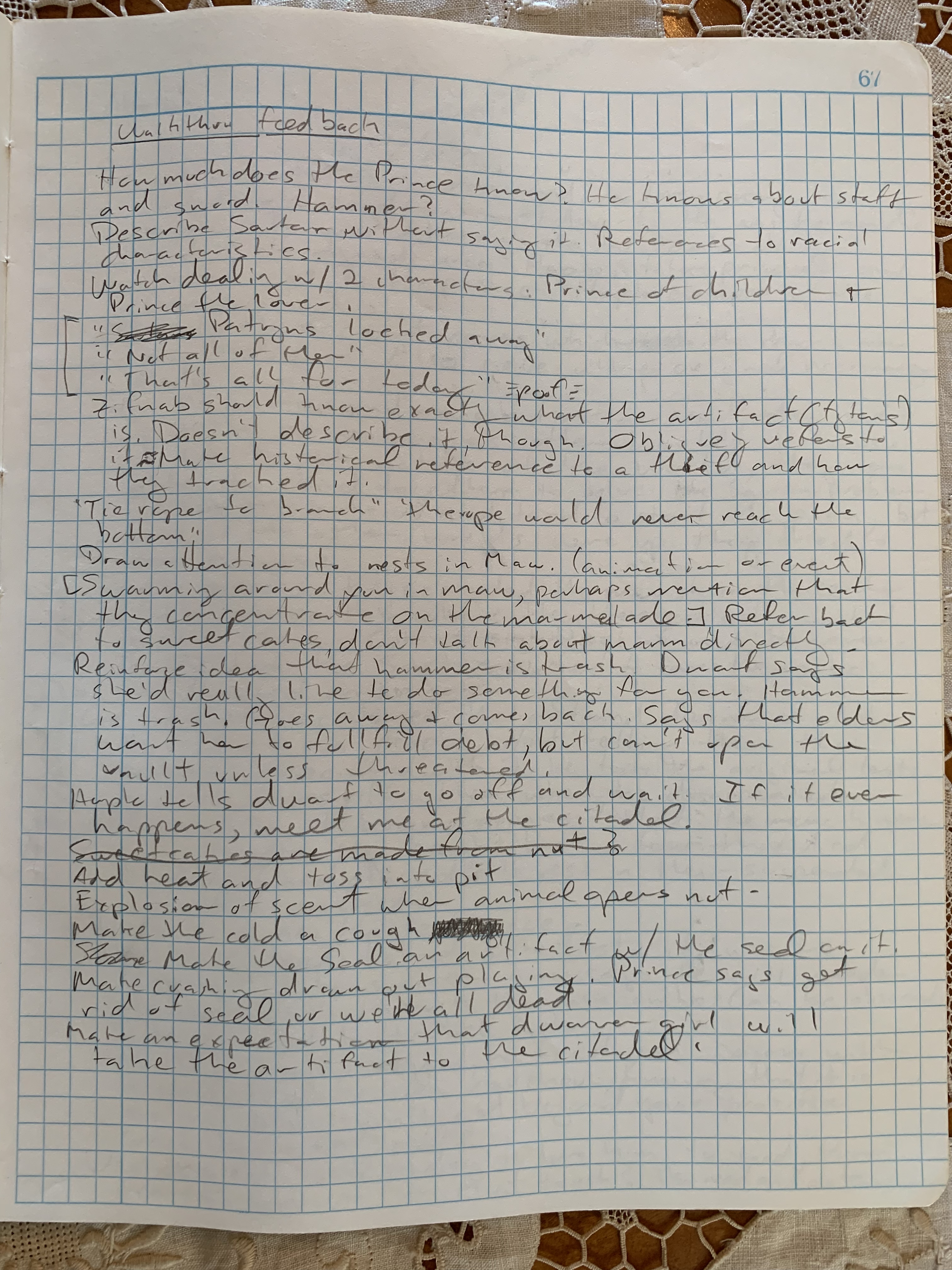 Pryan. This world was harder. I felt more pressure to make progress, but when I finished the second section (getting the crystal piece in the dwarves’ forest), I realized that it was trash. I threw it all away and started again. That’s another thing I teach: when to cut bait and start over. The second pass became what’s in there now (much better). That said, I loved writing Zifnab’s dialog from the beginning; it was one of the most enjoyable parts of designing this game.