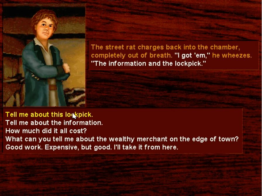 Death Gate was more current, it was a self-contained series with a different publisher, and its world and premise lent themselves to an adventure game structure. And I loved it! It didn’t hurt that the authors were also excited about making a game. Margaret Weis in particular was approachable and ready to help. I remember her telling me that, if there was something I needed to know, and it would be faster and easier to call her and ask, I should do so. And I did!