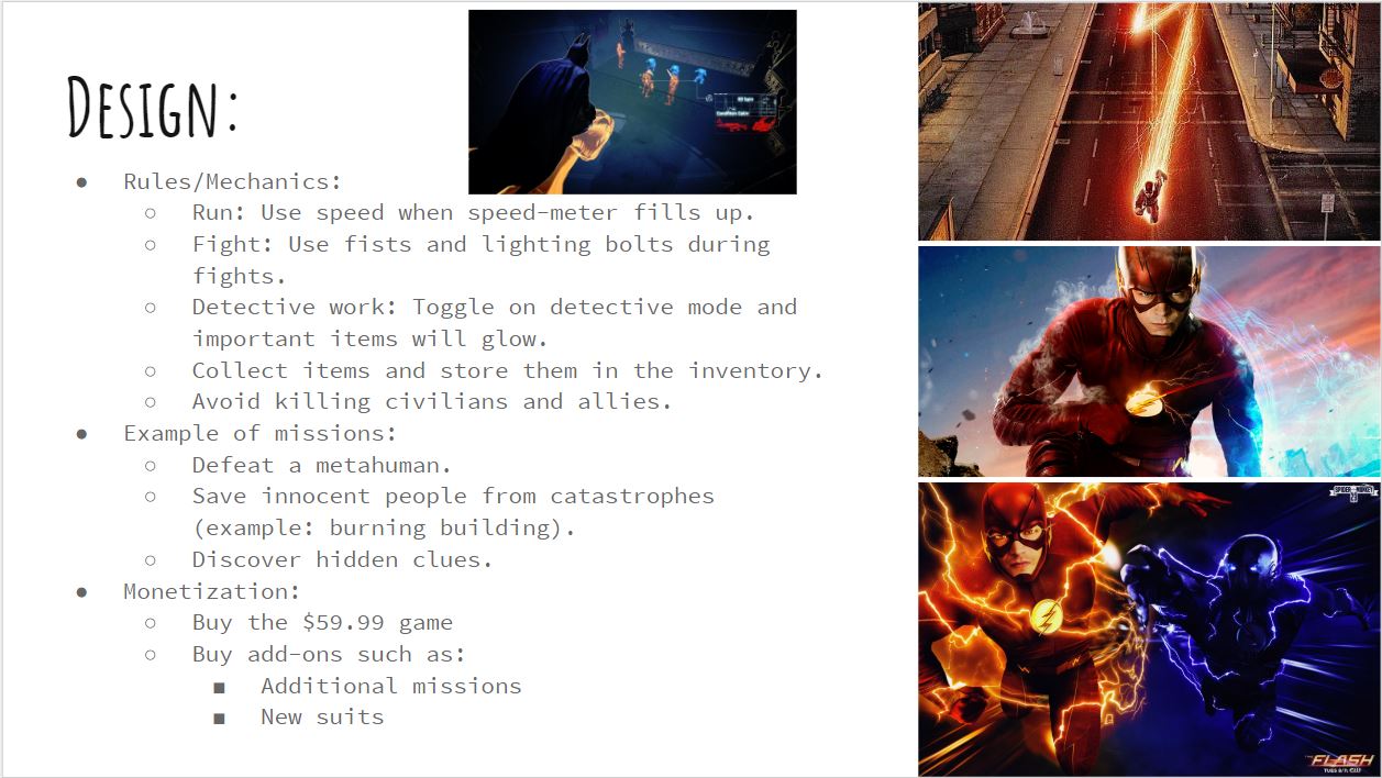 Here are a few of the projects from that class (I’m just showing the title card and one other sample page). These projects were interesting both to look at and listen to, especially when the student was passionate about the idea. Note that while two concepts are original, one relies on a license. I tell my students not to shy away from a property they want to use. Why not? It’s their dream game and nailing the down the license can be a job for another day.